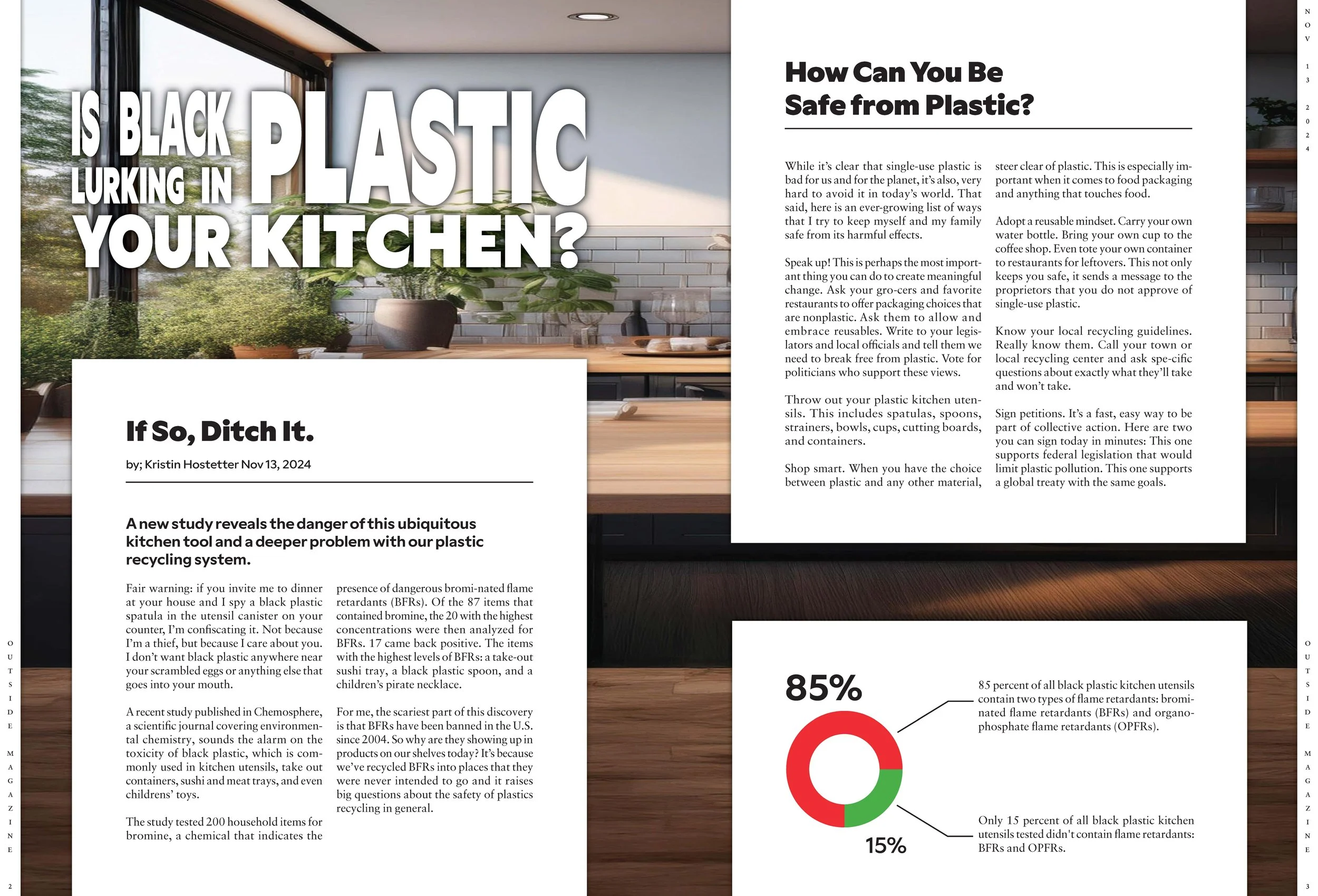 Different sketches were explored to determine my final design elements like hierarchy, type manipulation, and illustration. When creating the sketches, I considered making a cohesive two-page spread by incorporating body copy and image text boxes that spanned the middle of the two pages. Type manipulation was used to give hierarchy to separate words in the headline. I wanted to draw attention to the main subject of the article, black plastic. A light kitchen scene was spread across the two pages to give the already scary topic a more inviting and personal connection. As a complete spread, the imagery is comforting and familiar, inviting the reader, but the informative article warns about dangerous plastics in the kitchen.