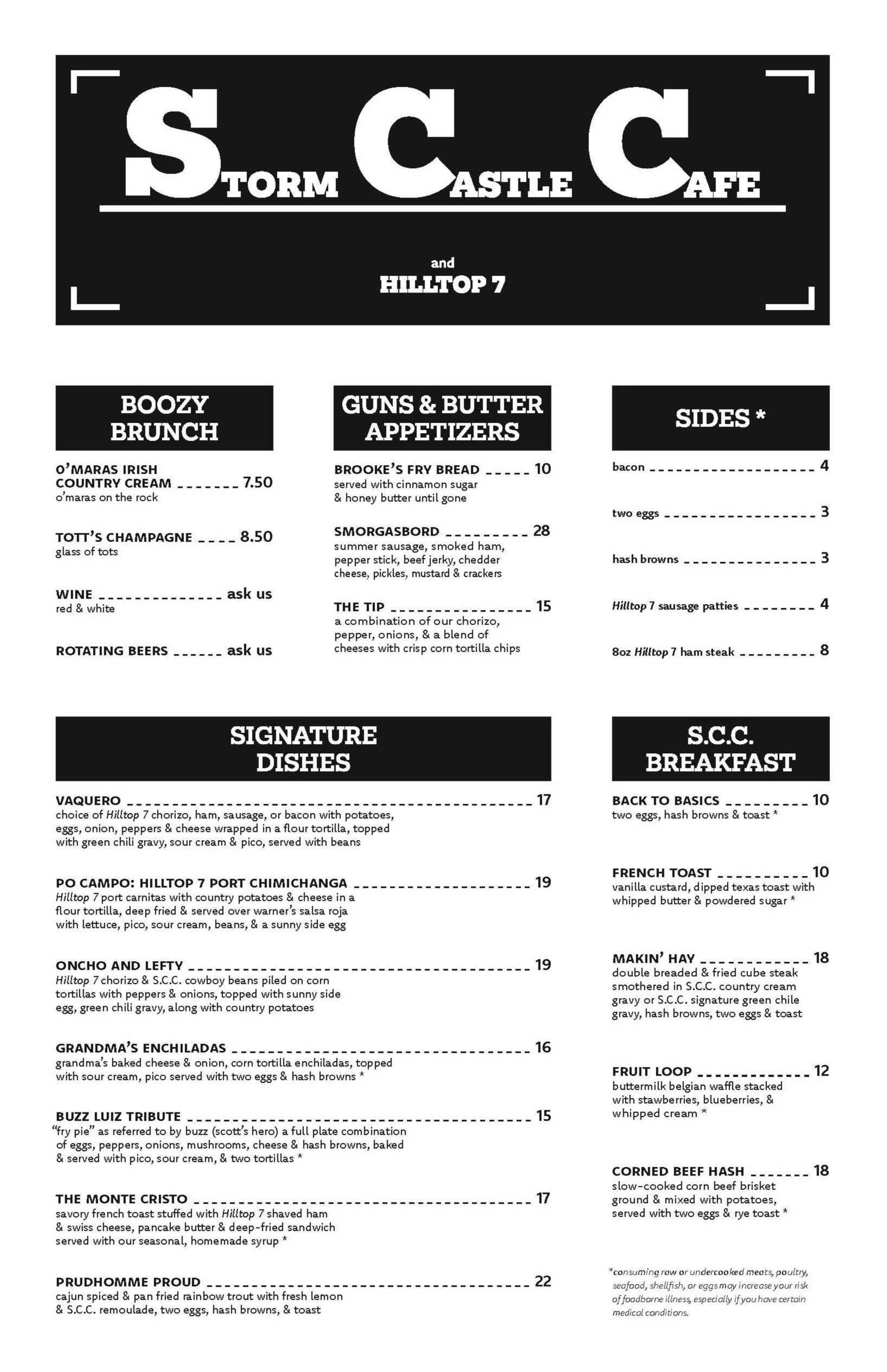The important underlying theme throughout my design process in creating a new menu for Storm Castle Cafe was the significance of hierarchy. In examining the original Storm Castle Cafe menu, hierarchy was not taken into account. My first menu highlights the signature dishes by featuring them prominently, ultimately showcasing the most expensive items. Throughout my first menu, white text is accompanied by black boxes that emphasize the breakfast options. In my second menu, I chose to highlight the appetizers, drinks, and sides to draw attention to add-ons with the breakfast. The signature dishes section remains prominent, occupying the most space on the menu, right next to the emphasized drinks, appetizers, and sides.
